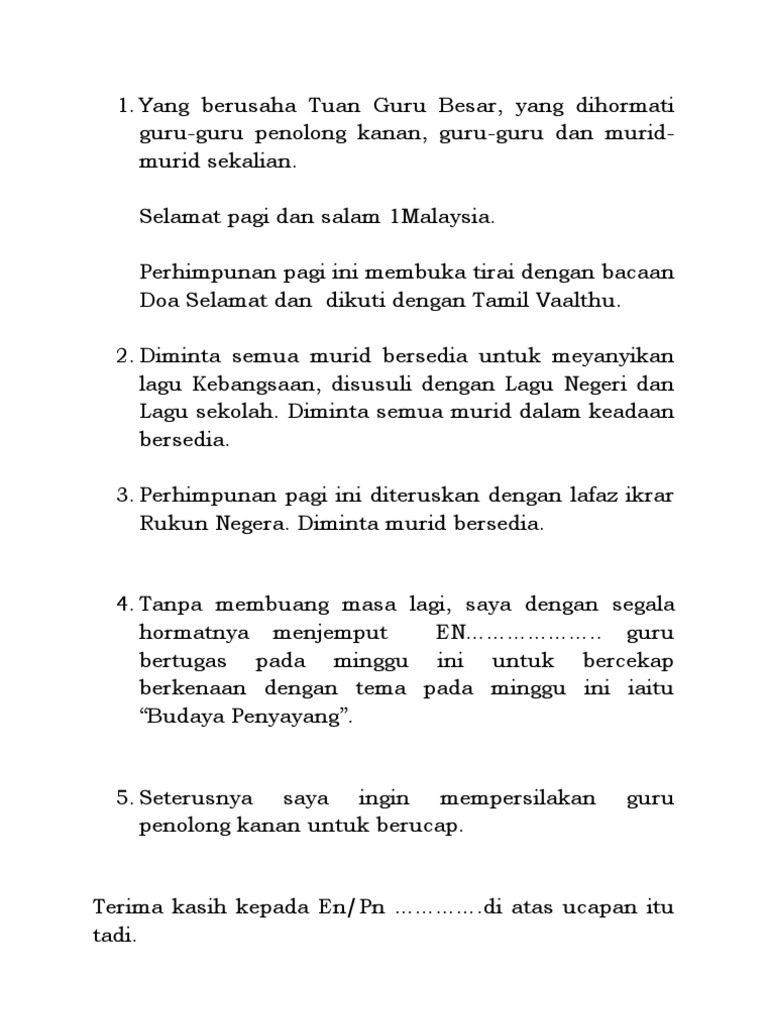 Murid-murid juga diminta membawa bahan bacaan semasa perhimpunan pagi. SKRIP PENGACARA MAJLIS -PERHIMPUNAN RASMI MINGGUAN SEKOLAH. A Negaraku b Melaka Maju Jaya c Wawasan Pendidikan Melaka d Dan Lagu Sekolah Dengan segala hormatnya hadirin diminta berdiri.